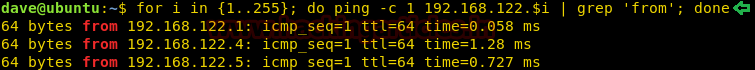 for i in {1..255}; do ping -c 1 192.168.122.$i | grep 'from' ; done