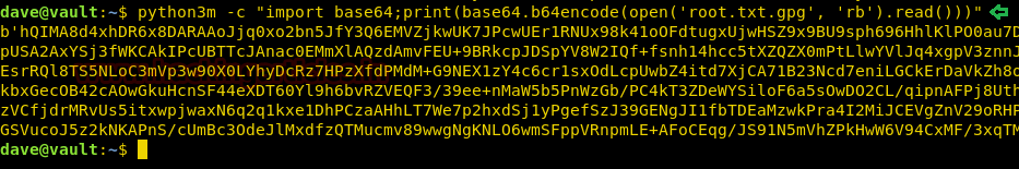 python3m -c "import base64;print(base64.b64encode(open('root.txt.gpg', 'rb').read()))"