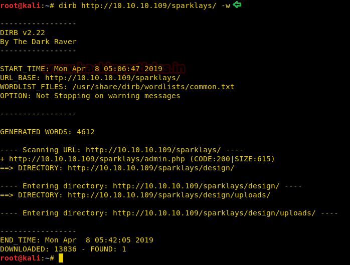 dirb //10.10.10.109/sparklays/ -w