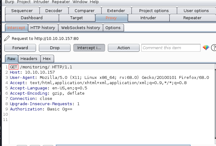 After trying a bunch of bruteforce techniques, we were not able to get through his login panel. That’s when it hit us, we should try HTTP Verb Tampering. So, we fired up our BurpSuite and captured the request of the /monitoring/ page.
