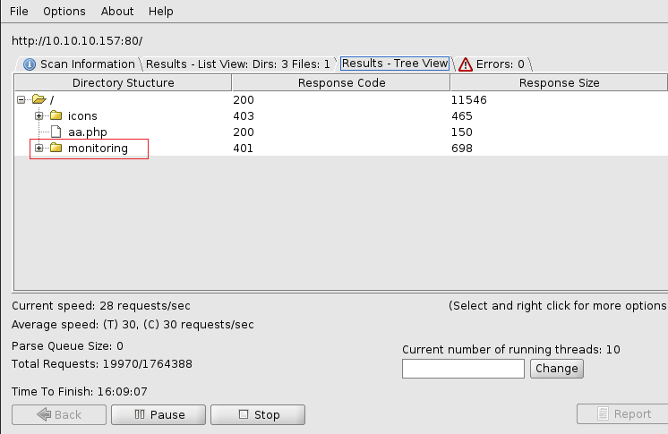 Its time to do some directory bruteforce on our target. Generally, we use the dirb tool but let’s show some love to DirBuster sometimes as well. Usage is pretty straight-forward. Enter the Target URL, locate the dictionary you want to use for the bruteforce. Here, in this case, we will be using the medium.txt. It can be found in Kali Linux by default. After everything is set, just click Start and kickback.