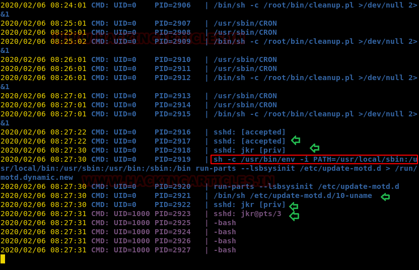 Interestingly, we found that the above command was running when jkr connects to ssh to access the server, so we can assume that every time we connect to ssh as jkr, the script will run with the help of the command.