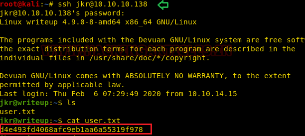 ssh jkr@10.10.10.138 su root cd /root cat root.txt