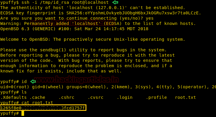 After signing the RSA keys, we use the RSA key to login through SSH as the root user. After logging in we find a file called “root.txt”. Finally, we take a look inside the content of the file and find the final flag.