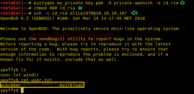 puttygen my_private_key.ppk -O private-openssh -o id_rsa chmod 600 id_rsa ssh -i id_rsa alice1978@10.10.10.107