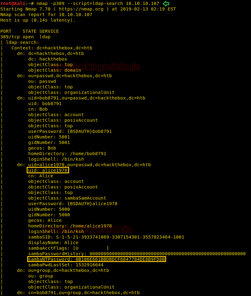 As LDAP service is running on port 389, we use nmap script called “ldap-search” to enumerate the target machine and we find the password hash for user “alice1978”.