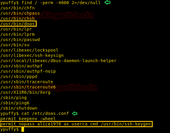 Now we check the files with suid bit enabled and find that “doas” is available on the target machine. It is a command utility similar to the “sudo” command. Now we check “/etc/doas.conf” to find what commands we can run. We find that we can run “/usr/bin/ssh-keygen” as user “userca”.