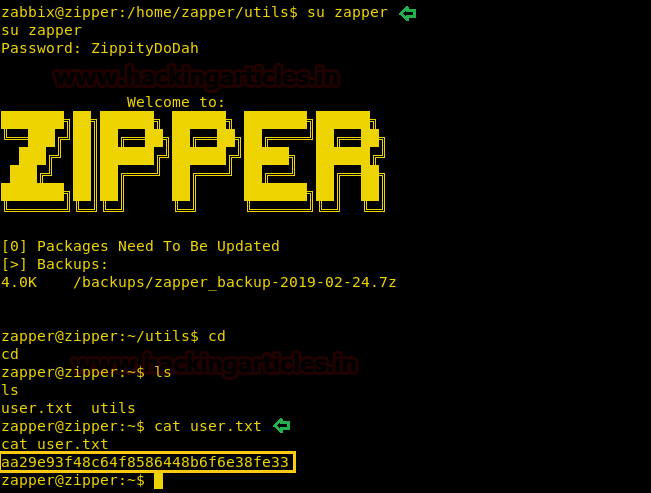 We switch user to zapper and use the password we find inside the “backup.sh” file. After we switch user, we again try to open the “user.txt” file and find the first flag.