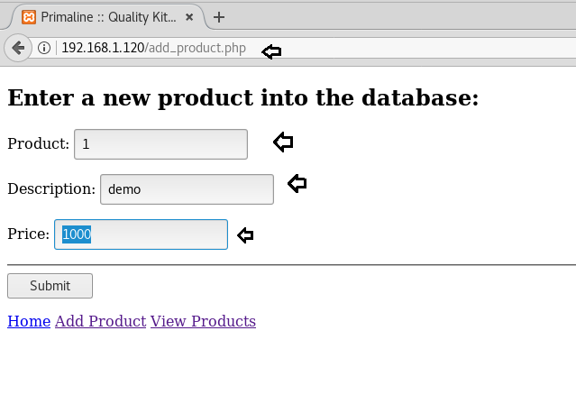Click on the Add Product option as shown in the above page http://192.168.1.120 which will redirect to http://192.168.1.120/add_product.php.Enter the input in the fields as shown below and click on Submit.