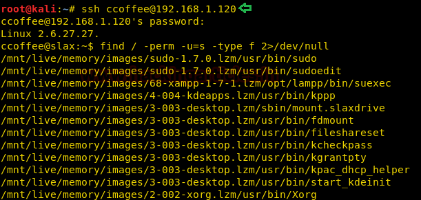 ssh ccoffee@192.168.1.120 find / -perm –u=s –type f 2>/dev/null