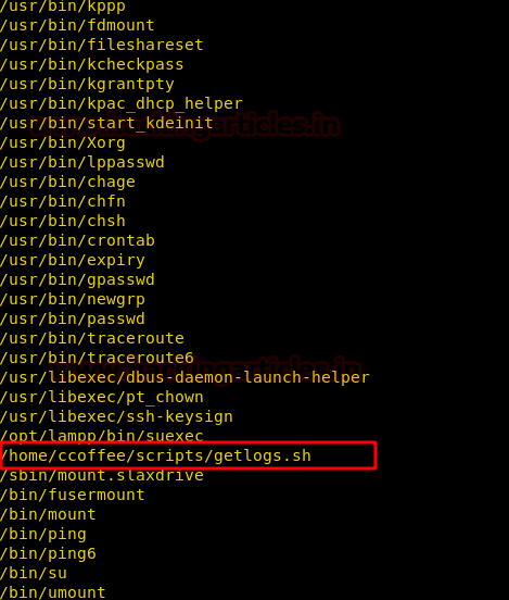 As it can be seen from the screenshot that of all the users listed, the user ccoffee has SUID bit enabled for getlogs.sh command located at the path /home/ccoffee/scripts, which means we can execute any command within getlogs.sh command.
