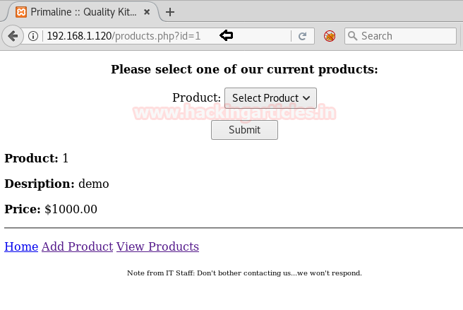 Now let’s try to look for SQL injection by trying with http://192.168.1.120/products.php?id=1’ and we will get an error, hence this URL is prone to SQL injection