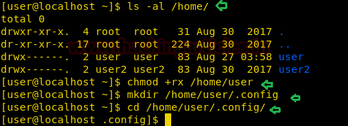 We check /home directory and find that the user directory has all permission for the owner only. We give read and execute permission to users in the same group and others. Then we created a directory called .config so that we can create our shared object inside it.