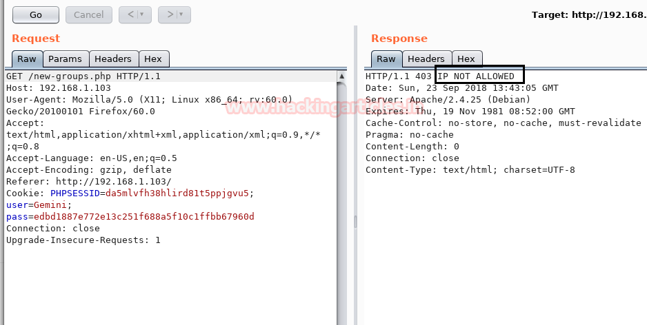 Here I look at the HTTP traffic and perceive a 403 IP NOT ALLOWED response. Hence proved the web application is running behind some kind of firewall.