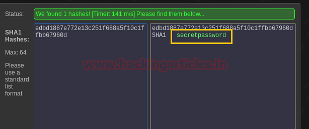 Then I use the online MD5 decryption for decrypting the hash value ‘edbd1887e772e13c251f688a5f10c1ffbb67960d’ and finally we obtain the plain text password “secretpassword”.