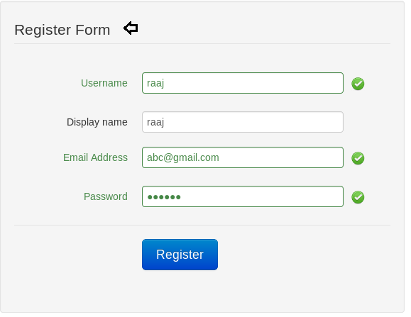 Next, we navigate to URL: http://192.168.1.103/registration.php and here observe the Register Form to register a new account. So I registered for an account as “raaj”.