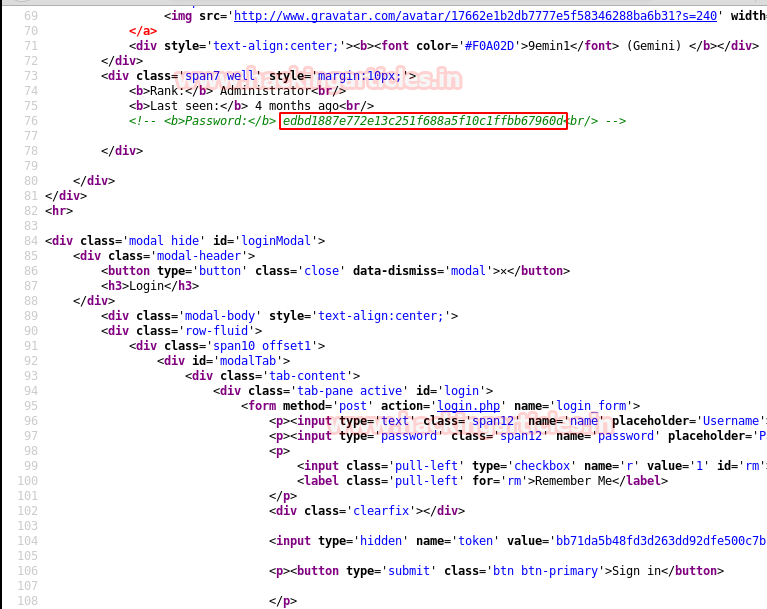 Then I check its source code where luckily I found the password hashes. I copied the hash value for its decryption.