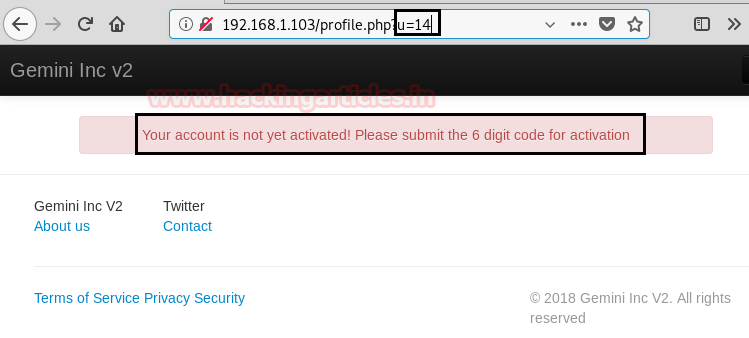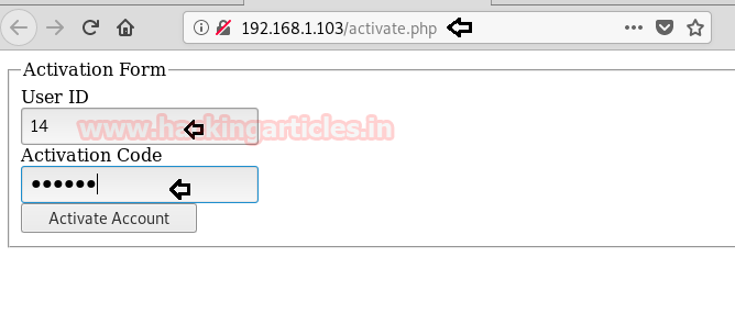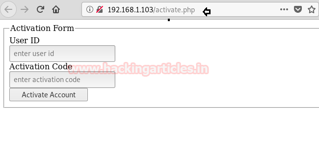 So further, we navigate to URL: http://192.168.1.103/activate.php and here observe the Activation Form that requires a User ID and Activation Code to activate the account.