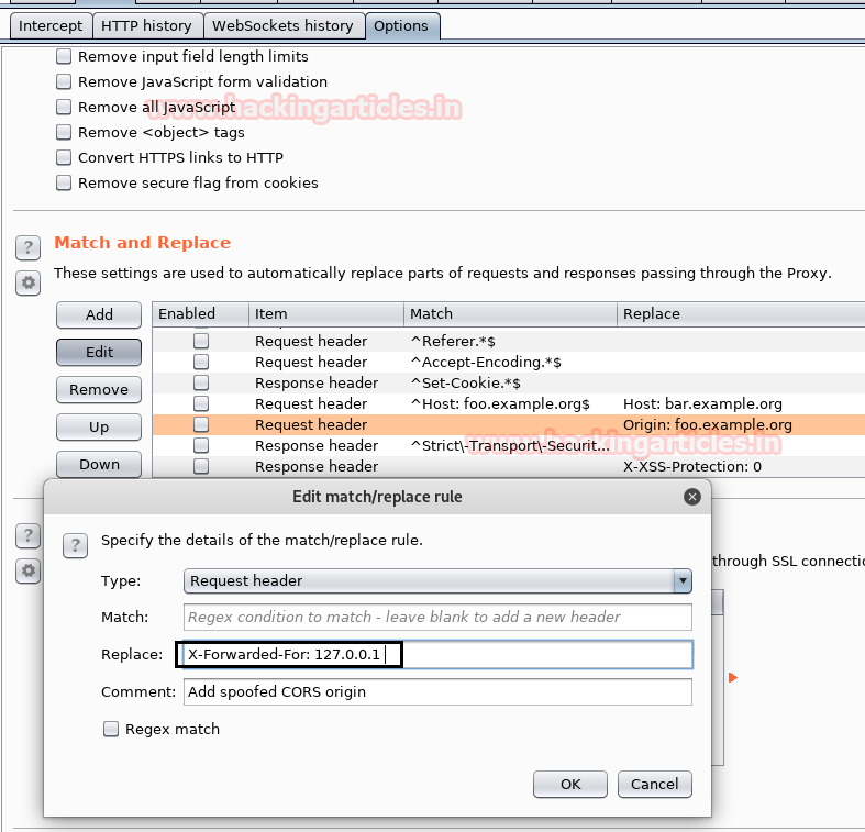 - A small window will pop-up for Edit match/replace rule, here paste “X-Forwarded-For: 127.0.0.1” in the replace text field.