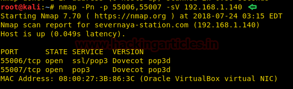 Earlier we had enumerated the port 55006 and 55007 which were open for unknown service thus we used nmap version scan for them and found SSL/pop3 for 55006 and pop3 for 55007 along with their version.