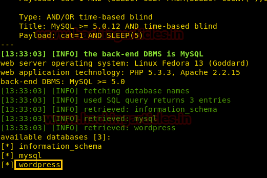 Upon successful completion of the SQLMAP scan, we came to know that the following databases listed are available in the website, and “WordPress” could be desired database name.