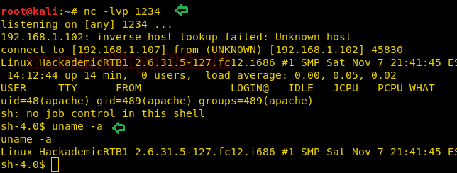 Ran the Netcat listener along with browsing the website URL again, upon which we got the initial/limited shell. Hereupon examining the Linux Kernel version we found that this could be vulnerable.