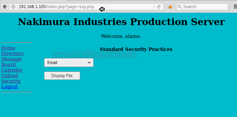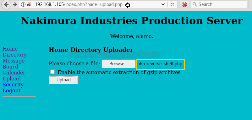 Once logged in, we noticed that actually, we are inside the user Alamo’s login page. After having a look at different pages, we navigated to the Upload page and tried to upload the php-reverse-shell.php file