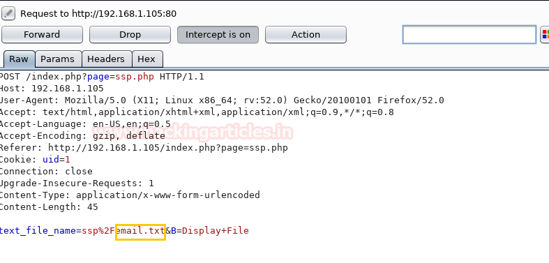 The parameter being passed in the POST request is text_file_name=ssp%2Femail.txt&B=Display+File as seen from the Burpsuite screenshot below