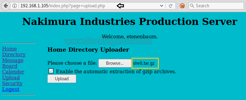 Click on Browse and select the file shell.tar.gz from the Kali Desktop machine. Click on the option “Enable the automatic extraction of gzip archives” and then upload the file.