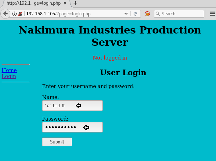 Username = ' or 1=1 # Password = ' or 1=1 #