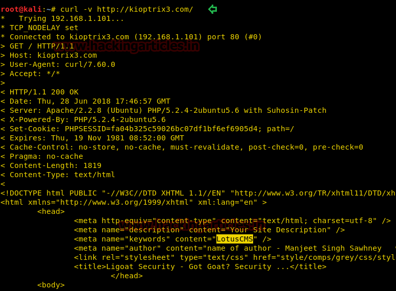 The curl command will provide the details of the website. With this, we also came to know that it is a CMS website as highlighted below in yellow (LotusCMS)