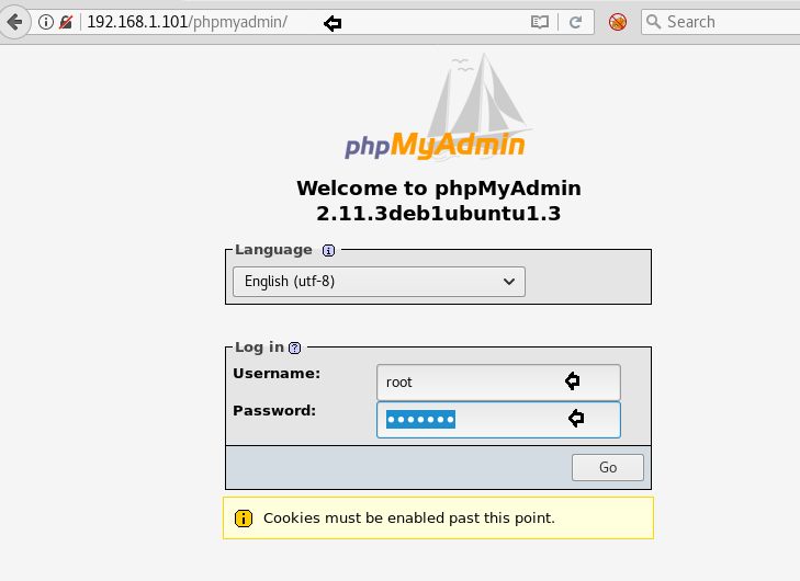 Browse the URL http://192.168.1.101/phpmyadmin and enter the credentials (received from above)